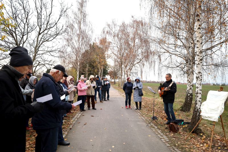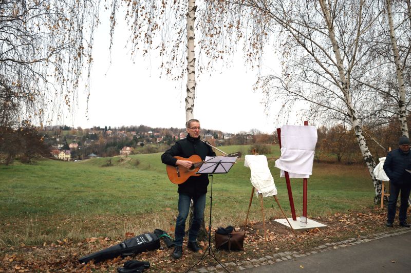 Wenn zugezogene Bürger fragen, ob es in Kleinnaundorf eine Kirche gibt, in der man heiraten könne, werden sie auf die kleine Kapelle an der Saarstraße hingewiesen. Dann meinen Sie, dass es sich doch dabei nur um eine Friedhofskapelle handeln würde. Die Bezeichnungen Friedhofskapelle und Friedenskapelle klingen schon ähnlich. Dabei hat die Friedenskapelle mit dem daneben liegenden Friedhof gar nichts zu tun, denn der befindet sich in städtischer Pflege. Diese Geschichte weiß Siegfried Herold zu berichten und erklärte damit, wie es zu der Idee kam, der den Blick auf diesen ersten Kirchenneubau nach dem 2. Weltkrieg in Sachsen etwas verändern sollte. Da man keinen besseren Aussichtspunkt auf die Kapelle haben kann als den vom Rad- und Wanderweg, war der Standort schnell gefunden. So entwickelte die ev.-luth. Kirchgemeinde die Idee zu dieser Installation. Mit Engagement und viel Initiative haben die Gemeindemitglieder das Projekt umgesetzt. Zum Buß- und Bettag (19.11.) konnte der Kapellenblick im Beisein vieler Bürger sowie Mitgliedern von Ortschaftsrat und Heimatverein enthüllt werden. Pfarrer Dr. Wolf-Jürgen Grabner vom Ev.-Luth. Kirchspiel Dresden-Süd, zu der die Gemeinde Bannewitz/ Kleinnaundorf gehört, wies darauf hin, dass Kleinnaundorf mit dem „Kapellenblick“ über ein deutschlandweites Alleinstellungsmerkmal verfügt. Denn hier steht nicht nur ein Bilderrahmen, bei dem das Bild fehlt. Nein, es ist ein 3D-Bild der Kapelle mit ständig neuer Gestaltung, die die Natur im Wechsel der Jahreszeiten neu kreiert. „Ich wünsche uns und allen, die hier vorbeikommen: Dass sie sich von diesem Denk-Mal einladen lassen zum Perspektivwechsel. Und dass Sie am Ende fröhlich und voller Freude ihren Weg auf dem alten Bahndamm fortsetzen.“