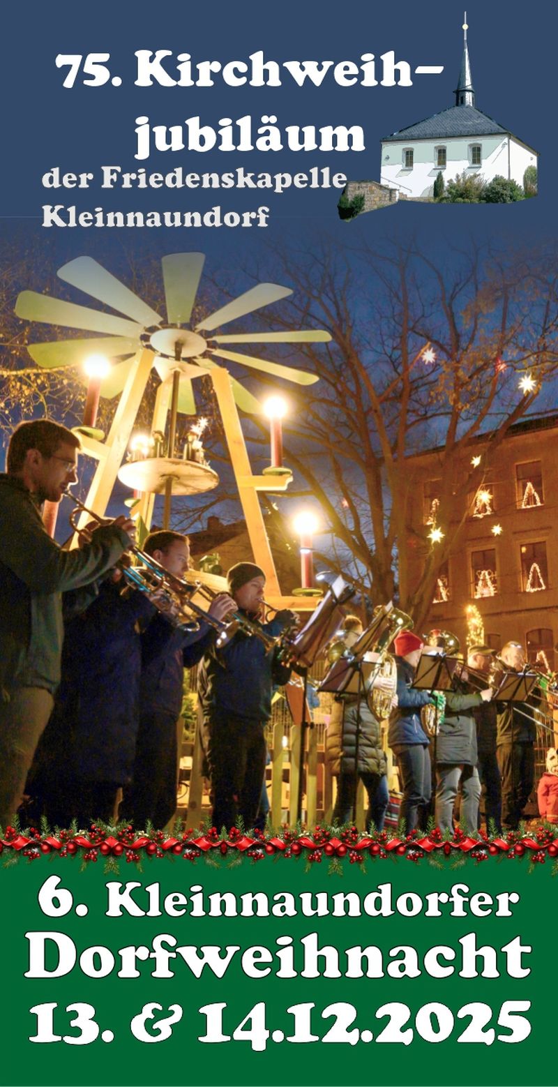 Am Samstag den 13.12. beginnt die Dorfweihnacht um 15 Uhr an der Friedenskapelle mit einem Adventsliedersingen. Um 15.45 Uhr startet ein Lampionumzug mit dem Friedenslicht von Bethlehem und dem Kapellenmodell von der Friedenskapelle zum Festplatz Kleinnaundorf, wo die Solosängerin Hanna Kästner an der Weihnachtspyramide im Sternedorf Weihnachtslieder präsentiert. Im Anschluss wird das Friedenslicht verteilt (bitte passende Leuchtmittel mitbringen) und der Weihnachtsmann hat seinen Besuch angekündigt. Um 21 Uhr findet das „Kino in der Friedenskapelle“ statt. Gezeigt wird der Film „Bach – ein Weihnachtswunder“.